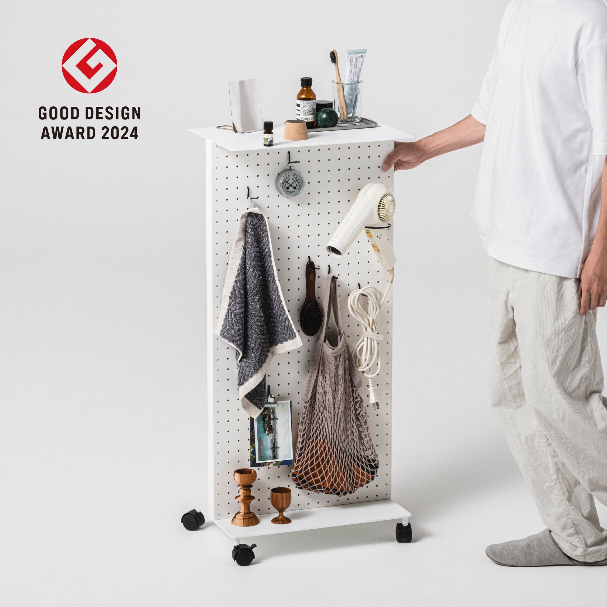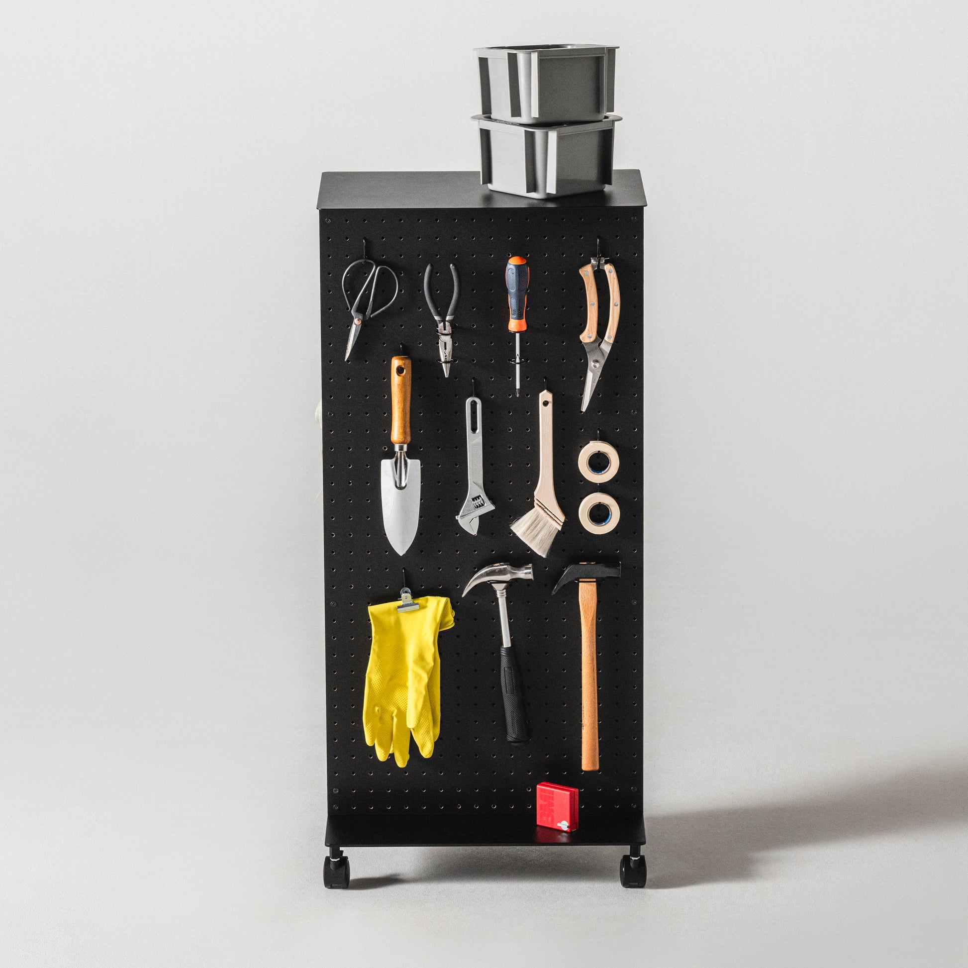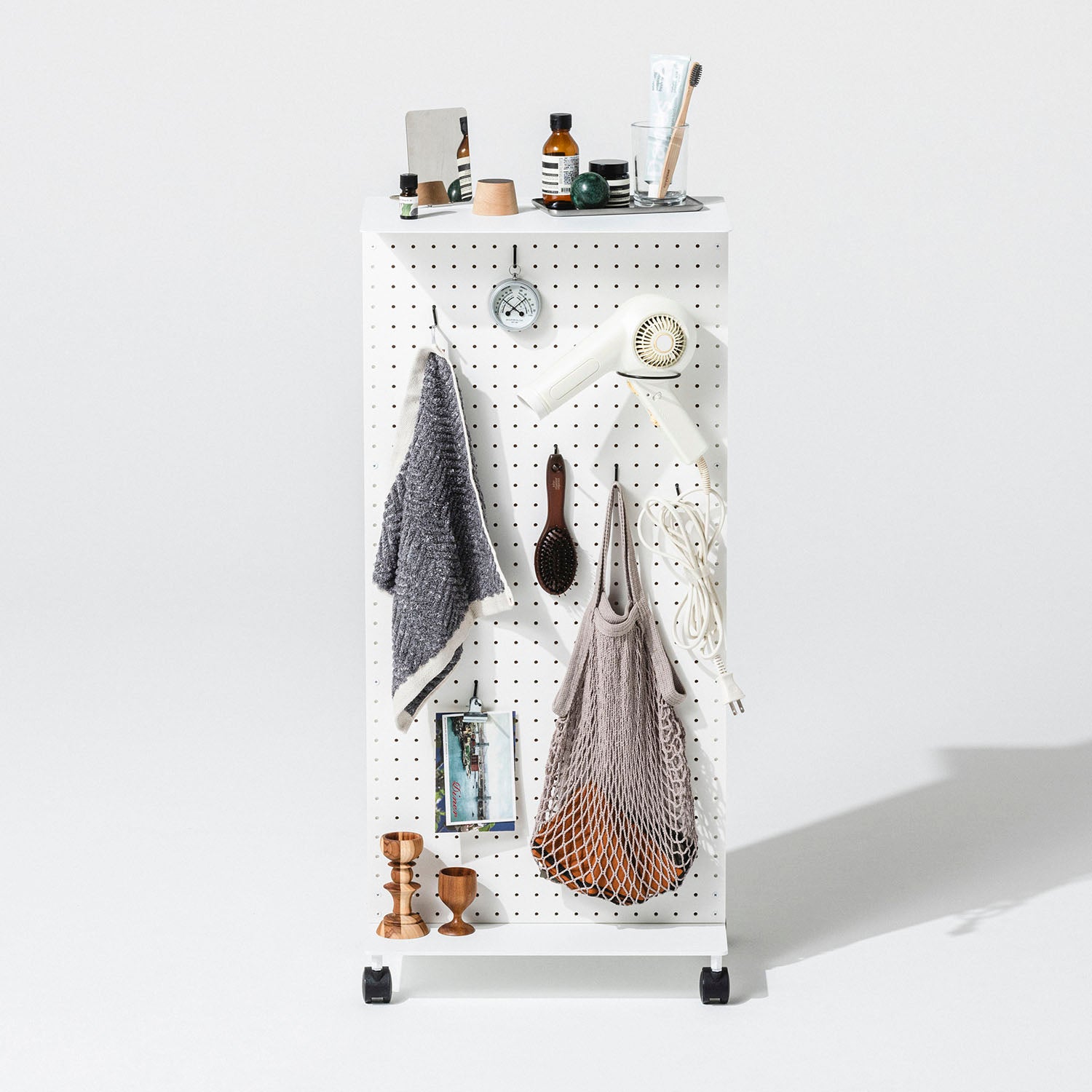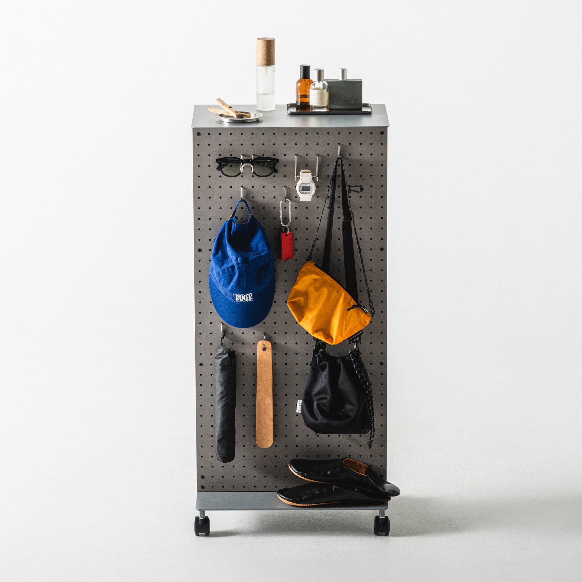 有孔ボードにフックなど様々なパーツをとりつけて、工具や文具はもちろん、鞄やリュック、鍵や財布や帽子、ガジェットやケーブル類を整理収納できます。